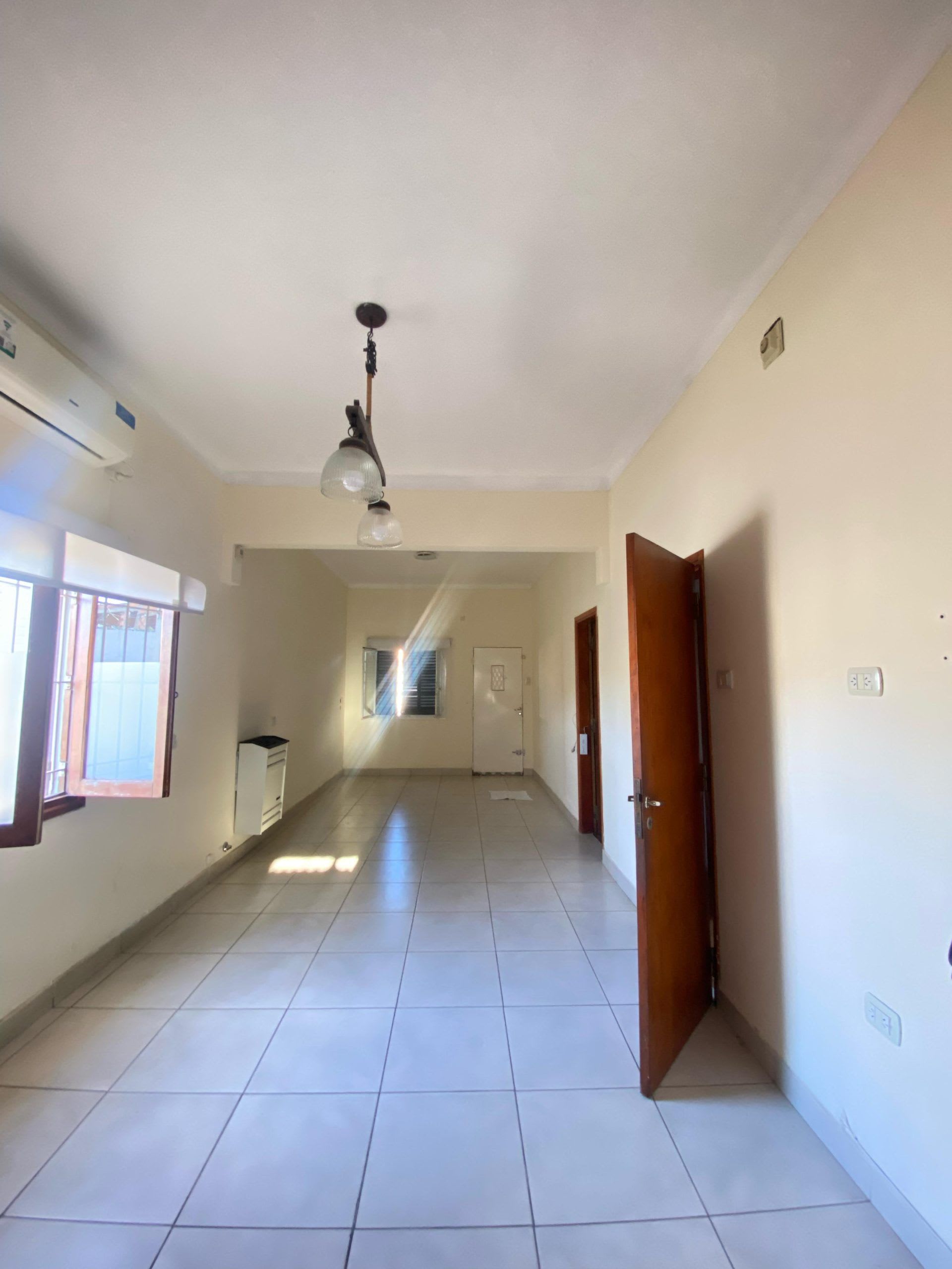 Living comedor con cocina industrial integrada y aire acondicionado.