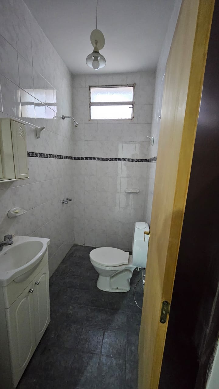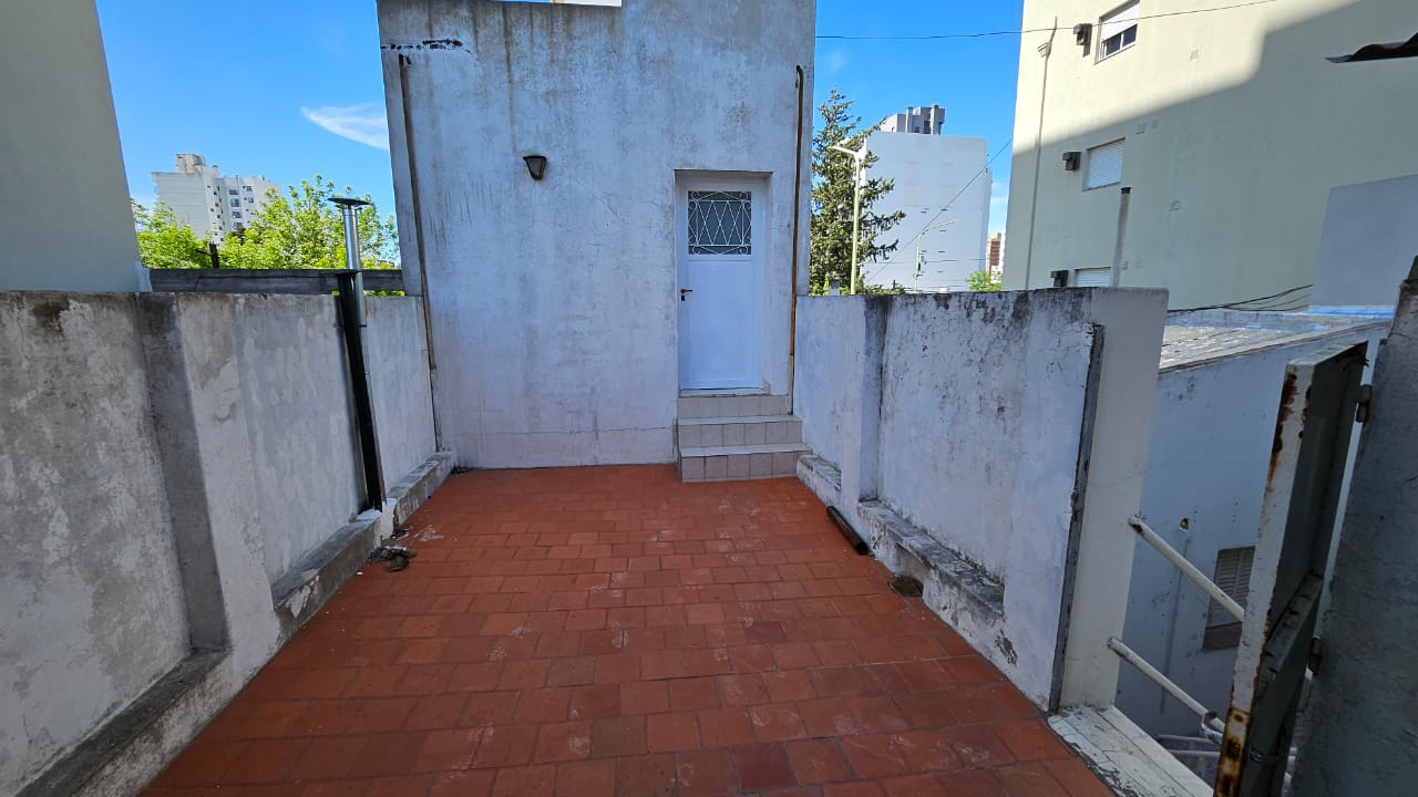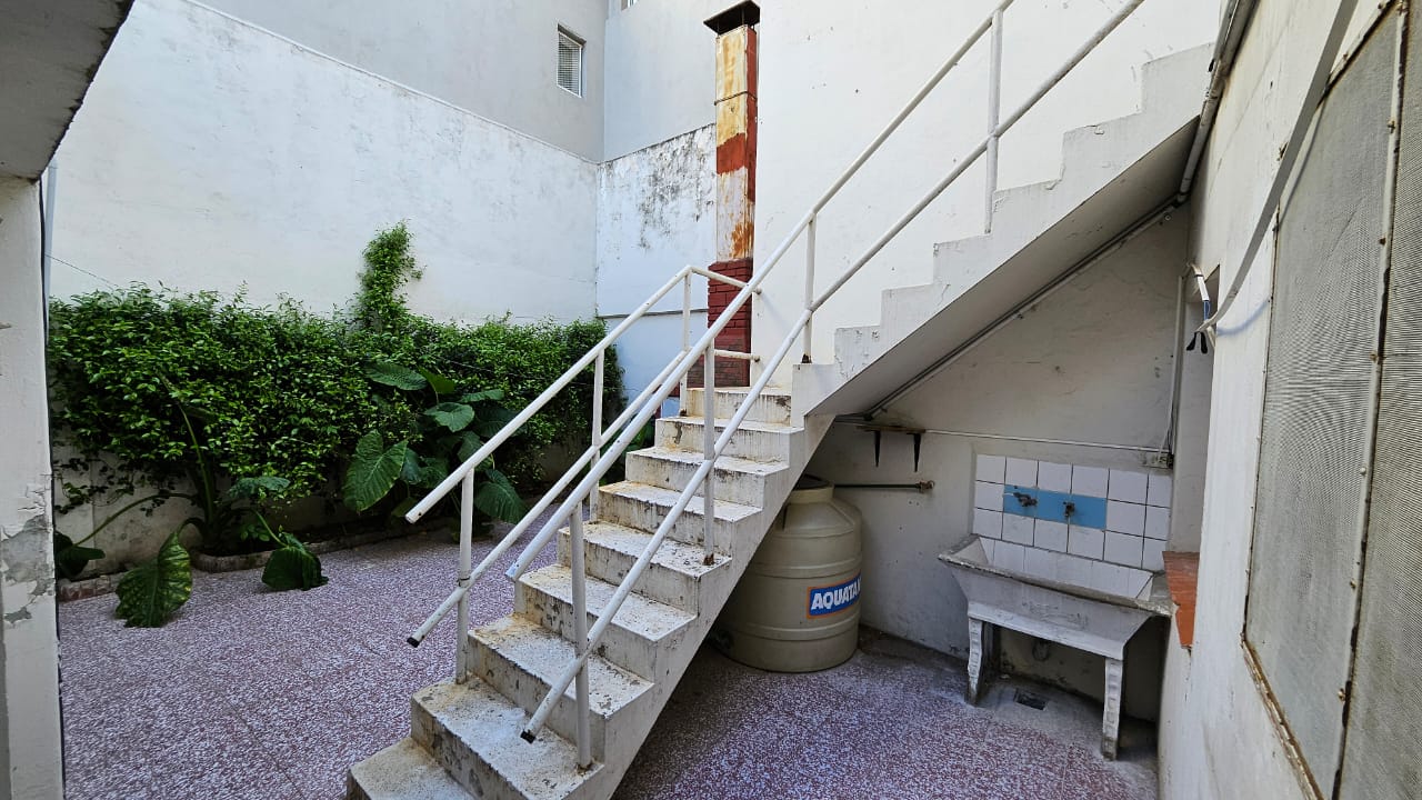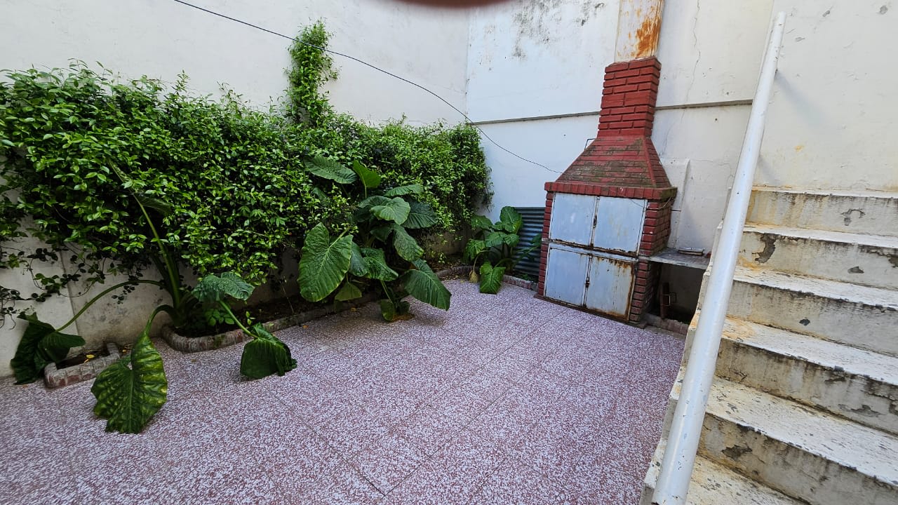 Patio embaldosado chico con parrilla y escalera exterior que comunica a la planta alta con otros dos dormitorios chicos sin placar y un baño completo .