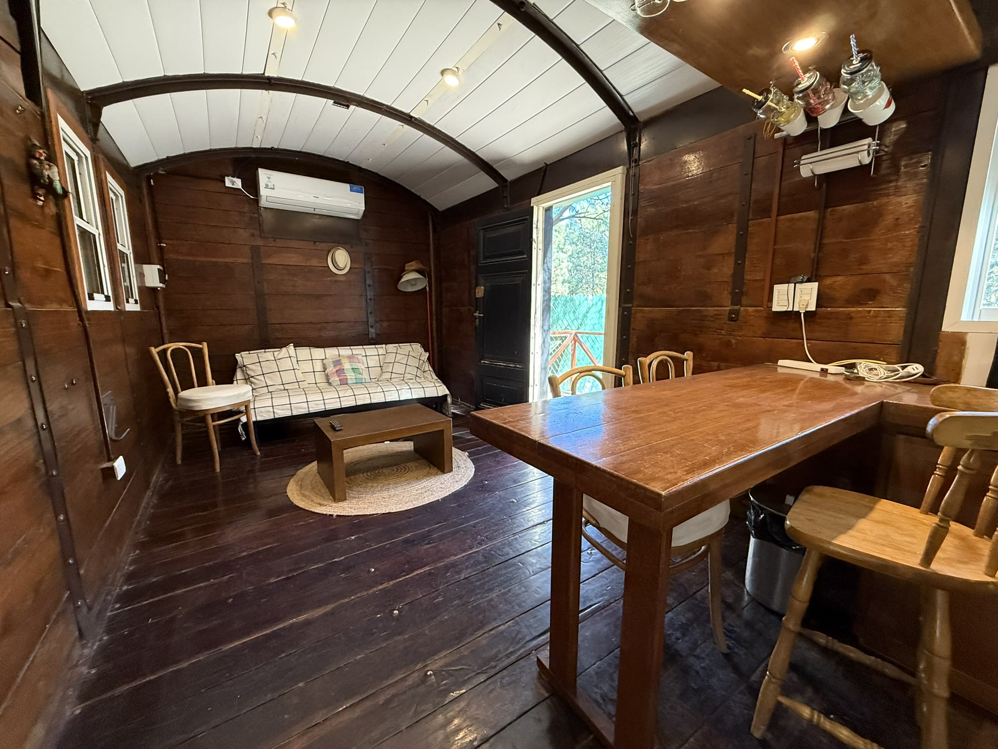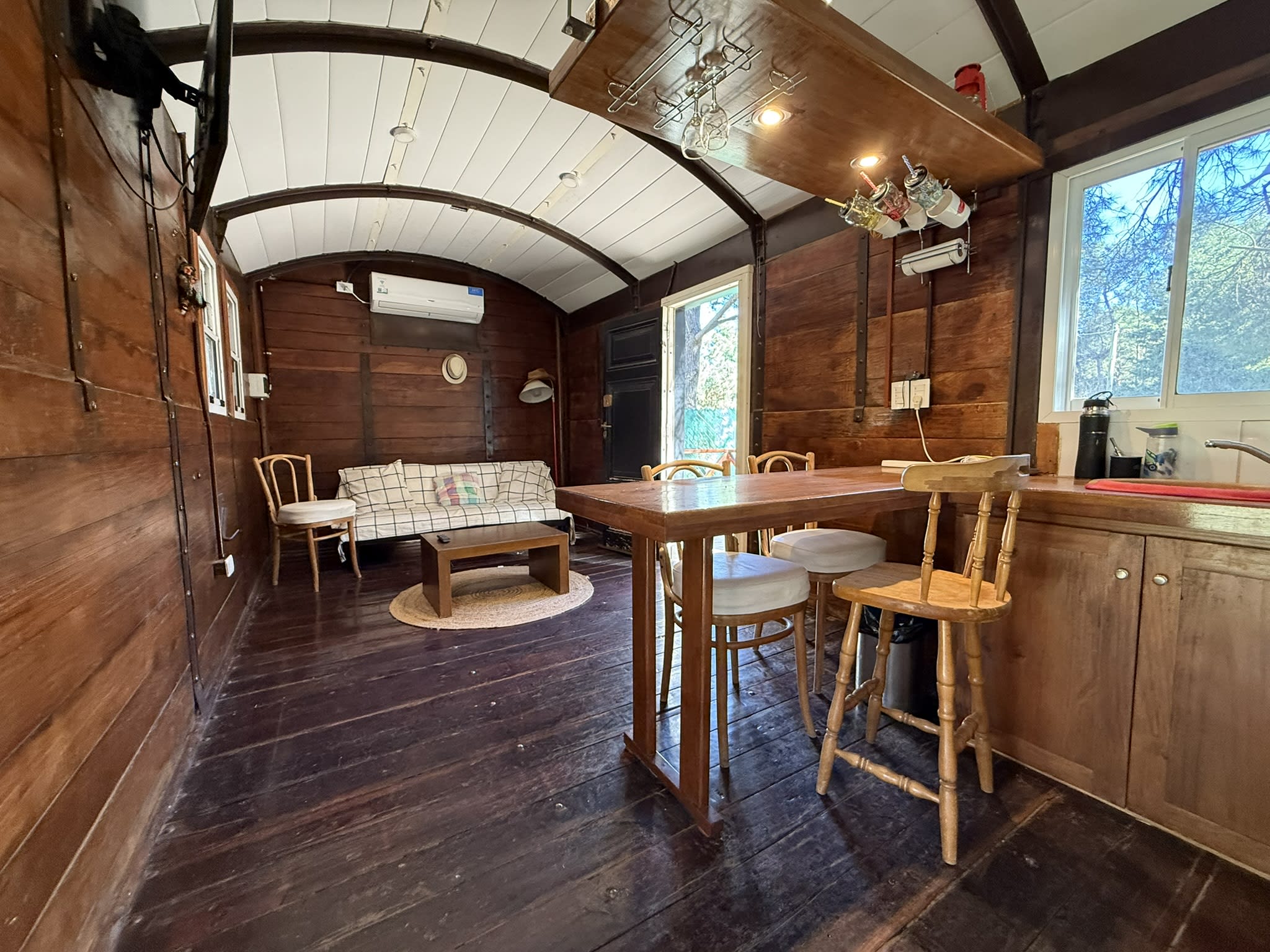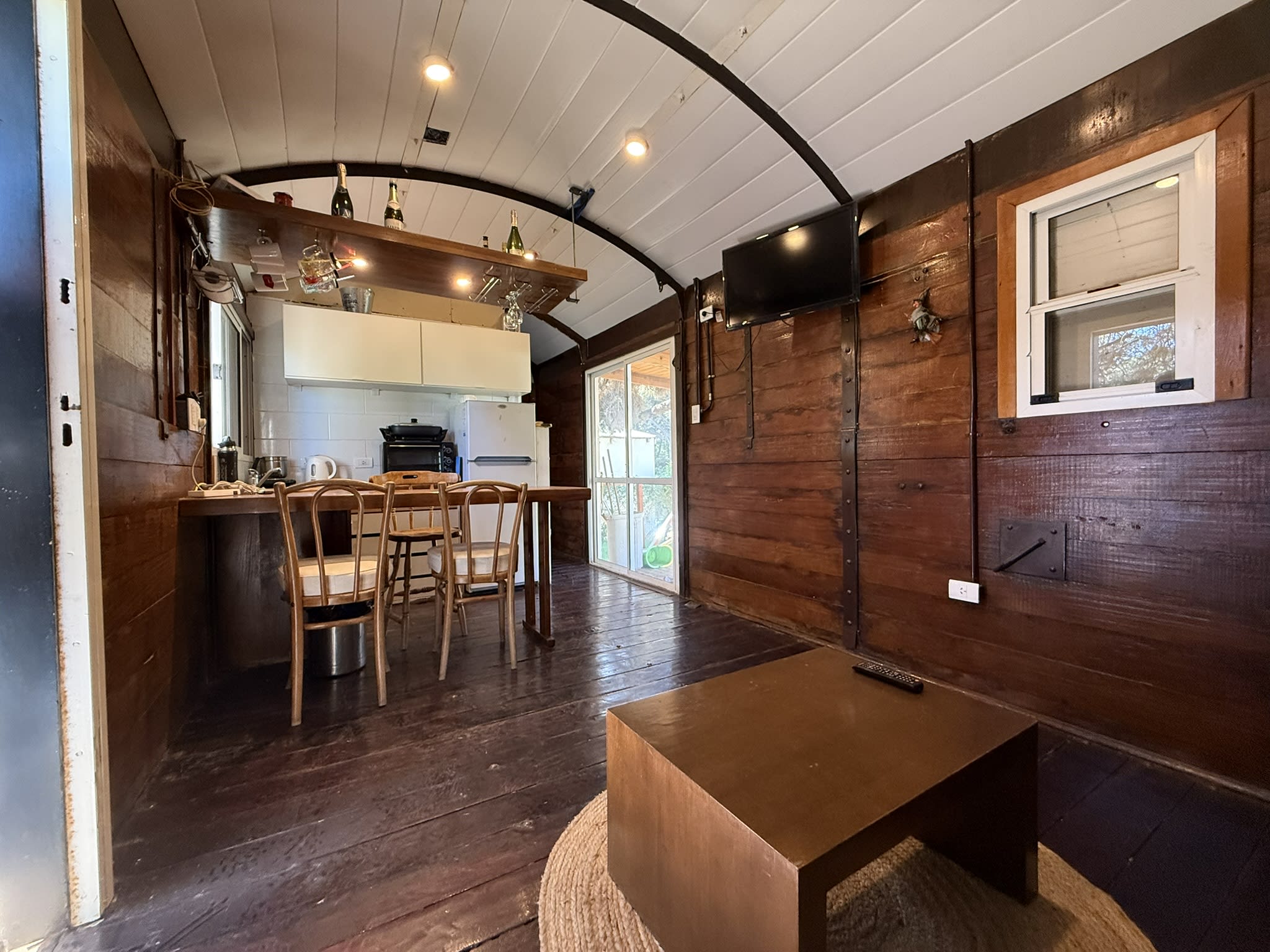 Vagon con 1 dormitorio, bano y cocina integrada por barra + deck de madera en la parte trasera
