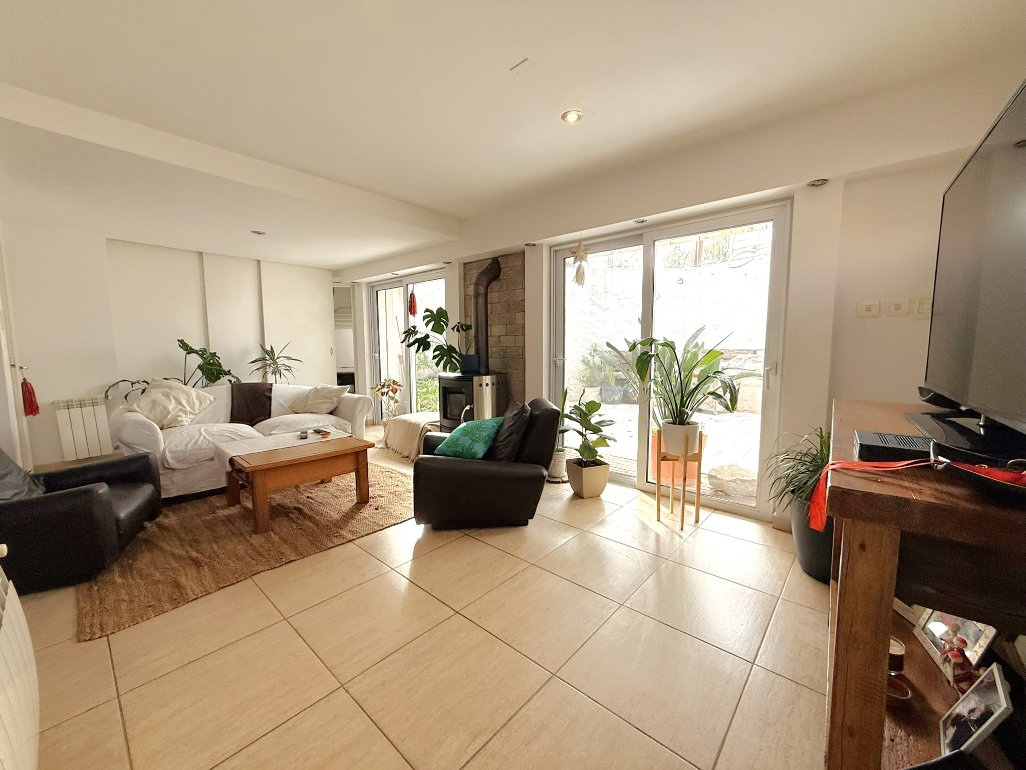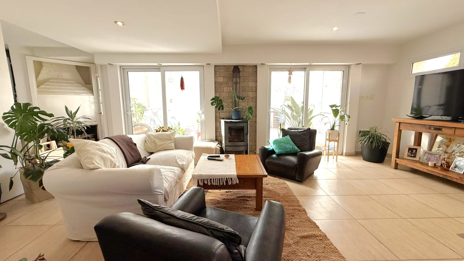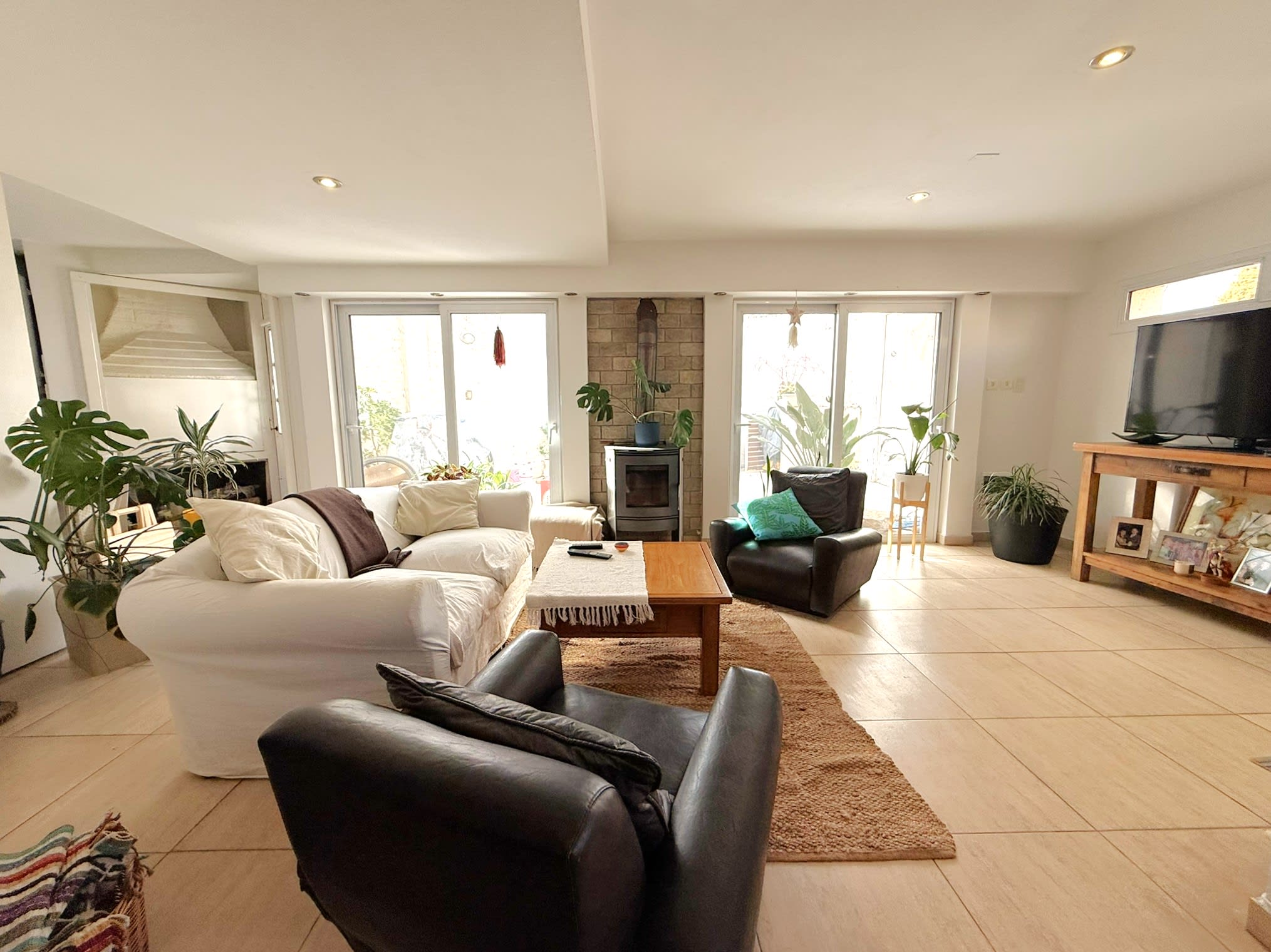 PB: Living con grandes ventanales, conectado con puertas corredizas al quincho con fogón. Cocina comedor integrada por barra. Baño con ducha y patio trasero (mediano).- Cochera semi cubierta .-