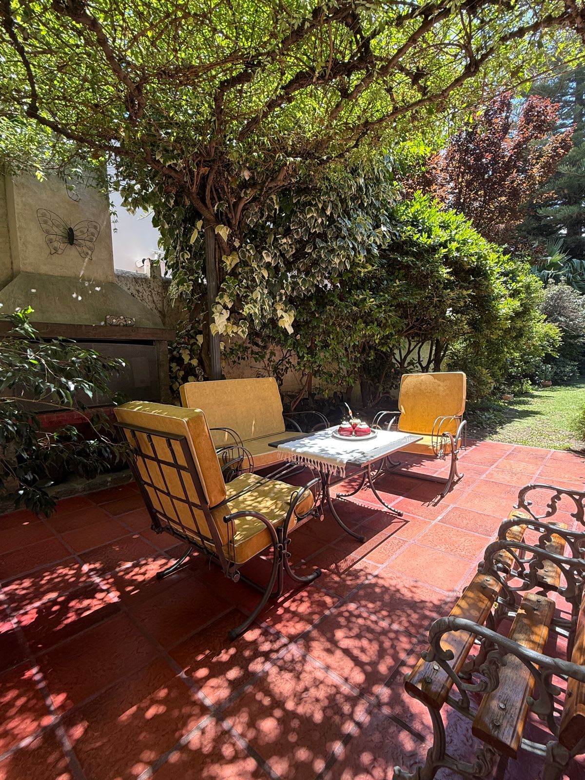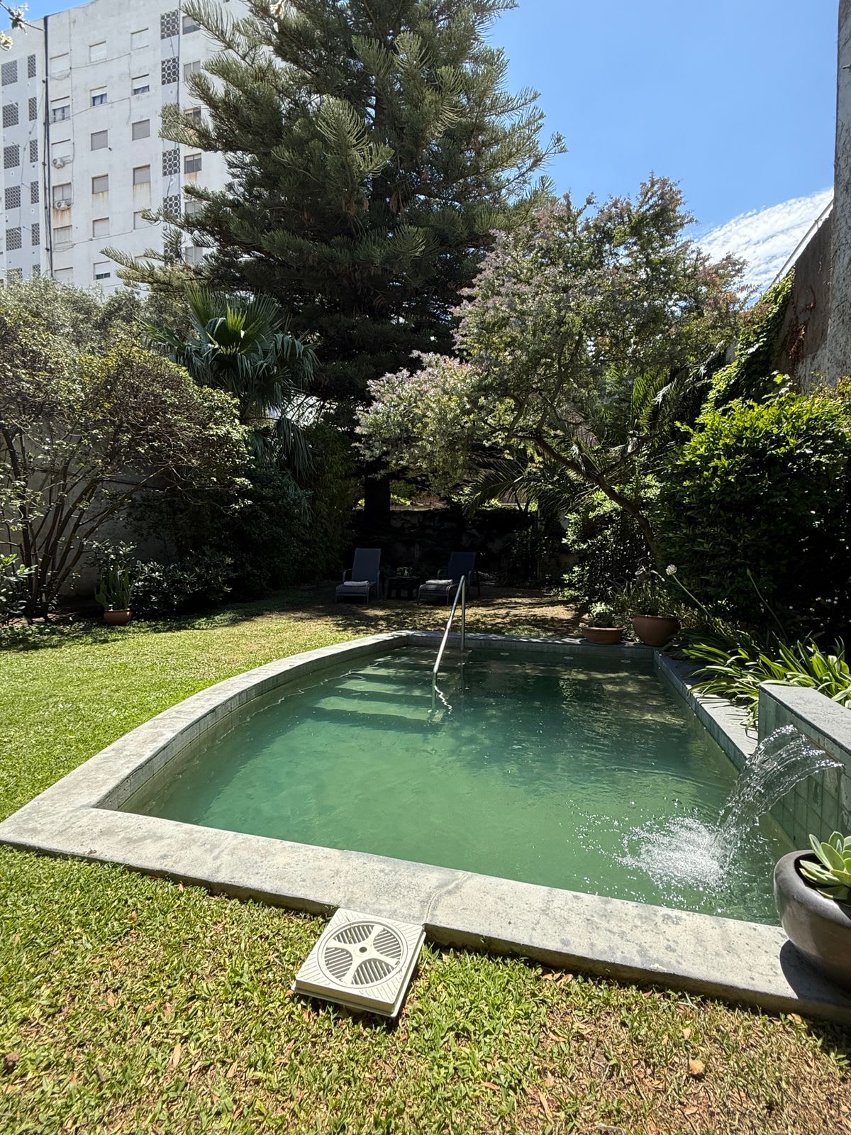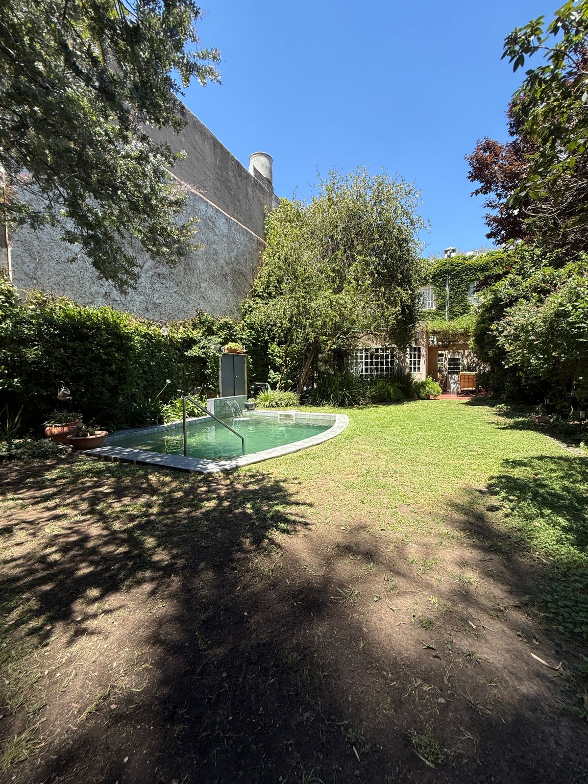 El jardín es uno de los grandes protagonistas: amplio, parquizado, con variedad de plantas, espacios de sol y sombra, y una piscina con cascada que aporta un clima de relax y naturaleza dentro de la ciudad.