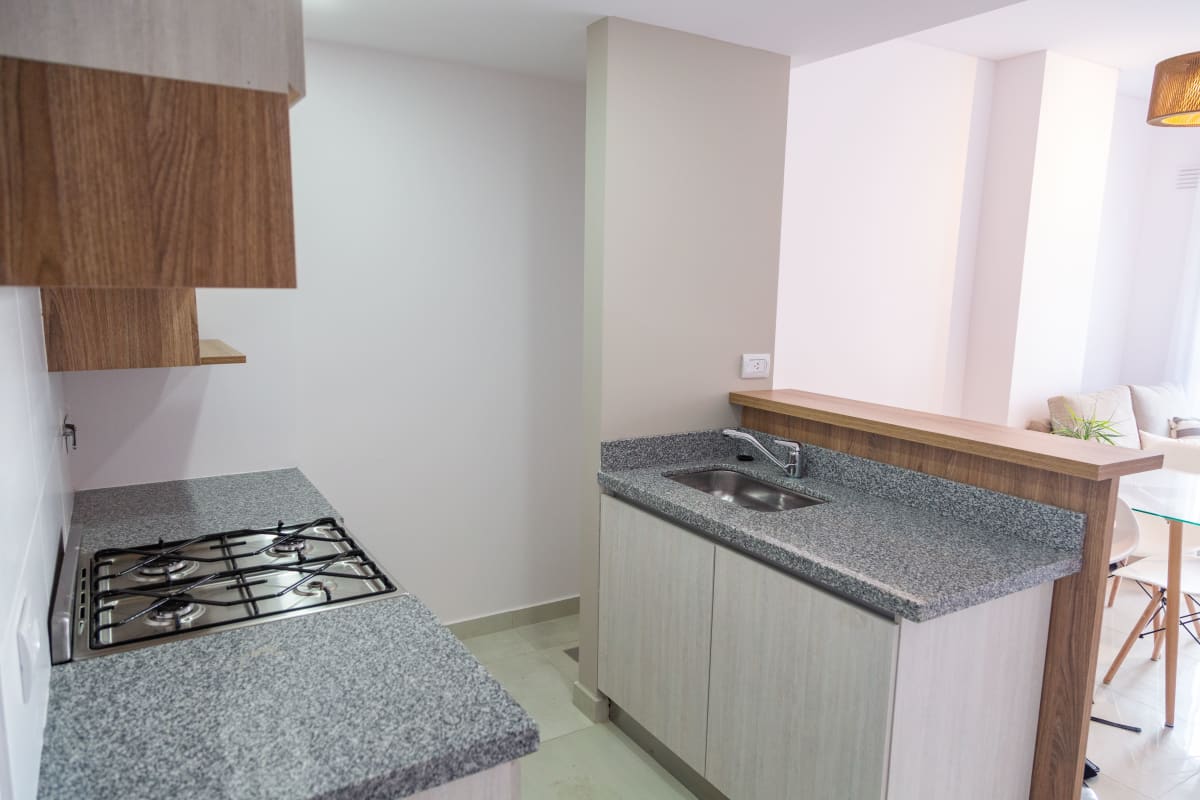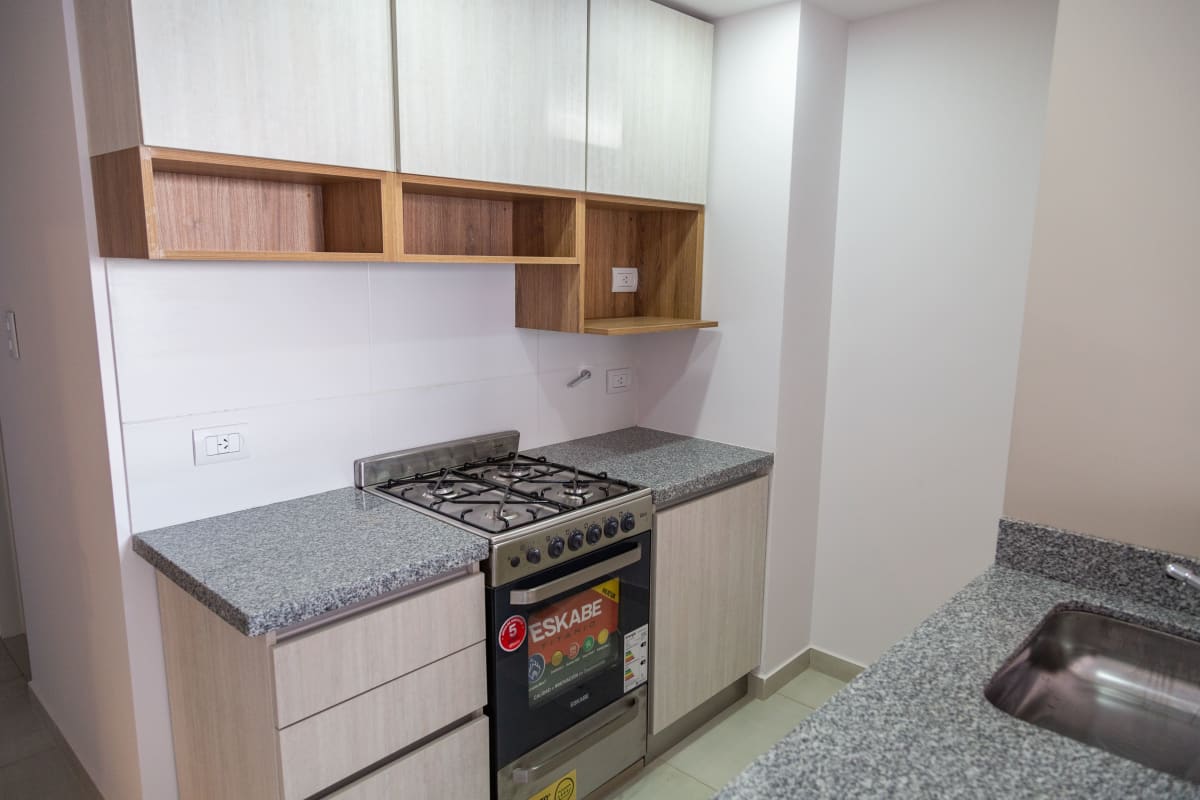 Posee living-comedor con acceso al balcón, cocina integrada con barra.