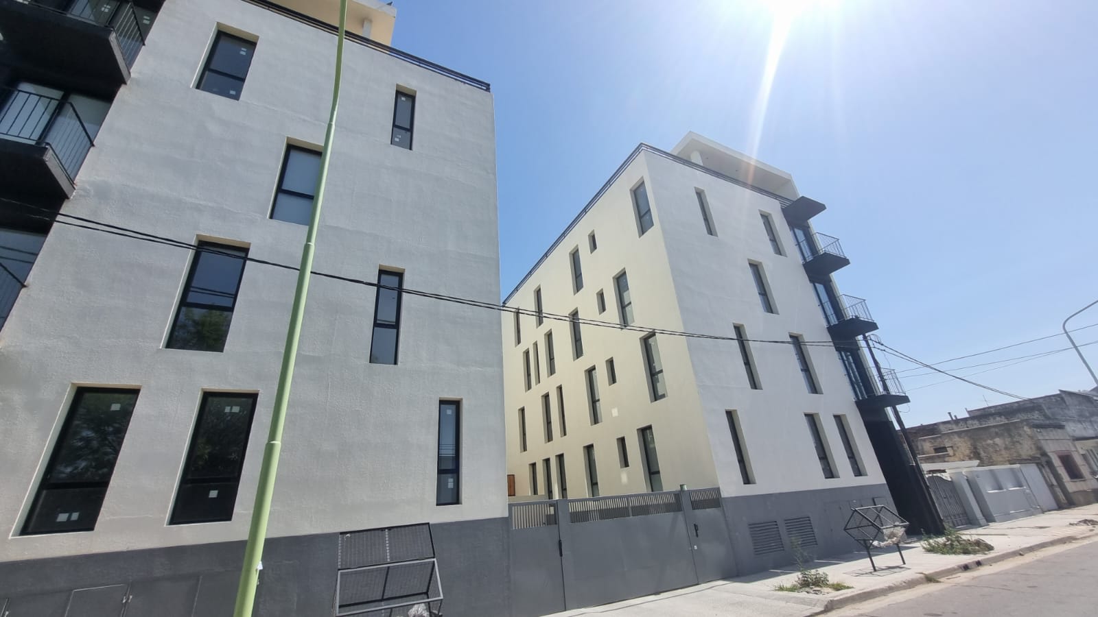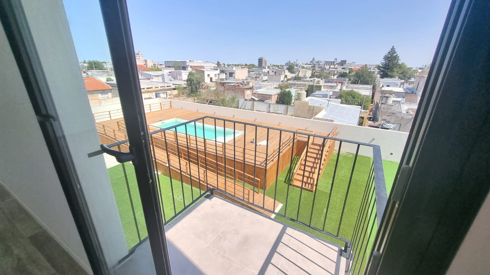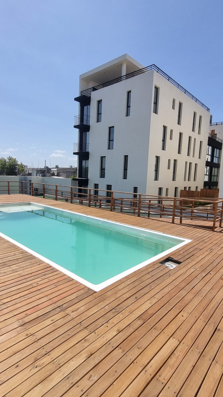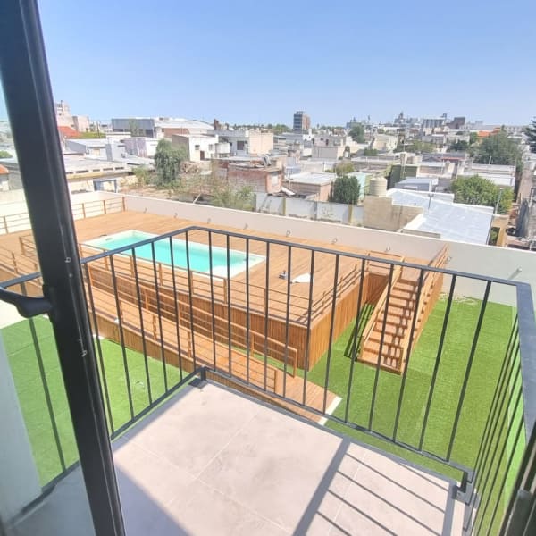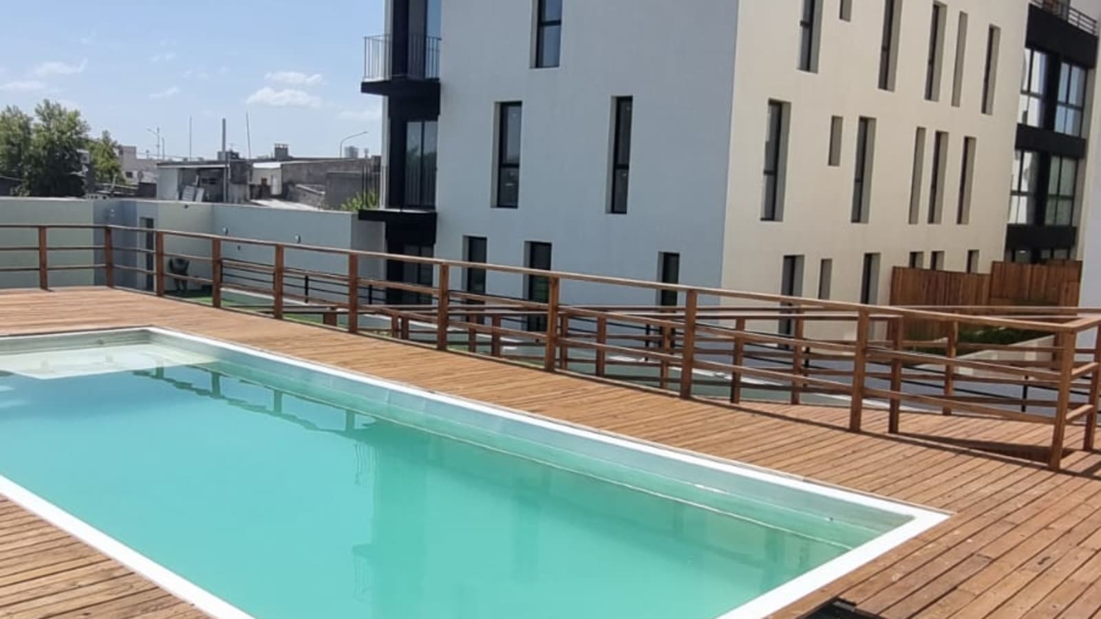 Edificio cuenta con patio y gran piscina.