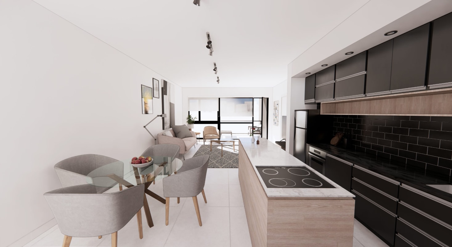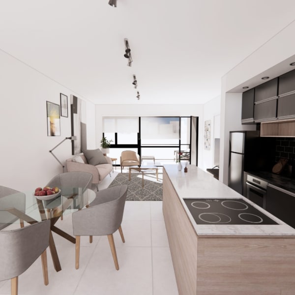 Departamento en venta de dos dormitorios en Guemes 336. Living comedor con cocina integrada. Dos dormitorios, uno en siute con vestidor. Dos baños completos. Dos balcones. Opcional cochera. Calefaccion por radiadores y pisos de porcelanato. Terraza equipada con parrilla. Plazo estimado de obra 19 meses.