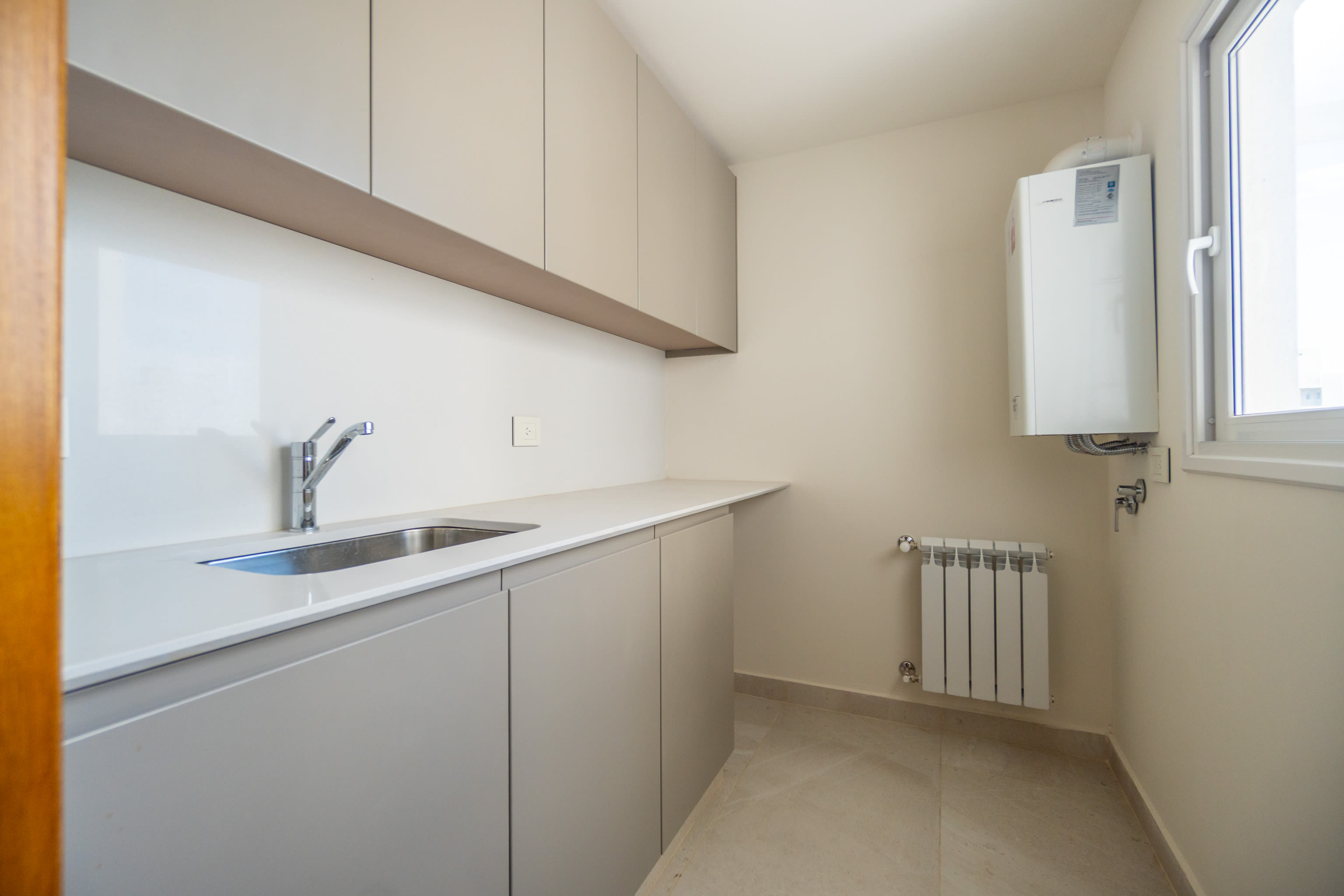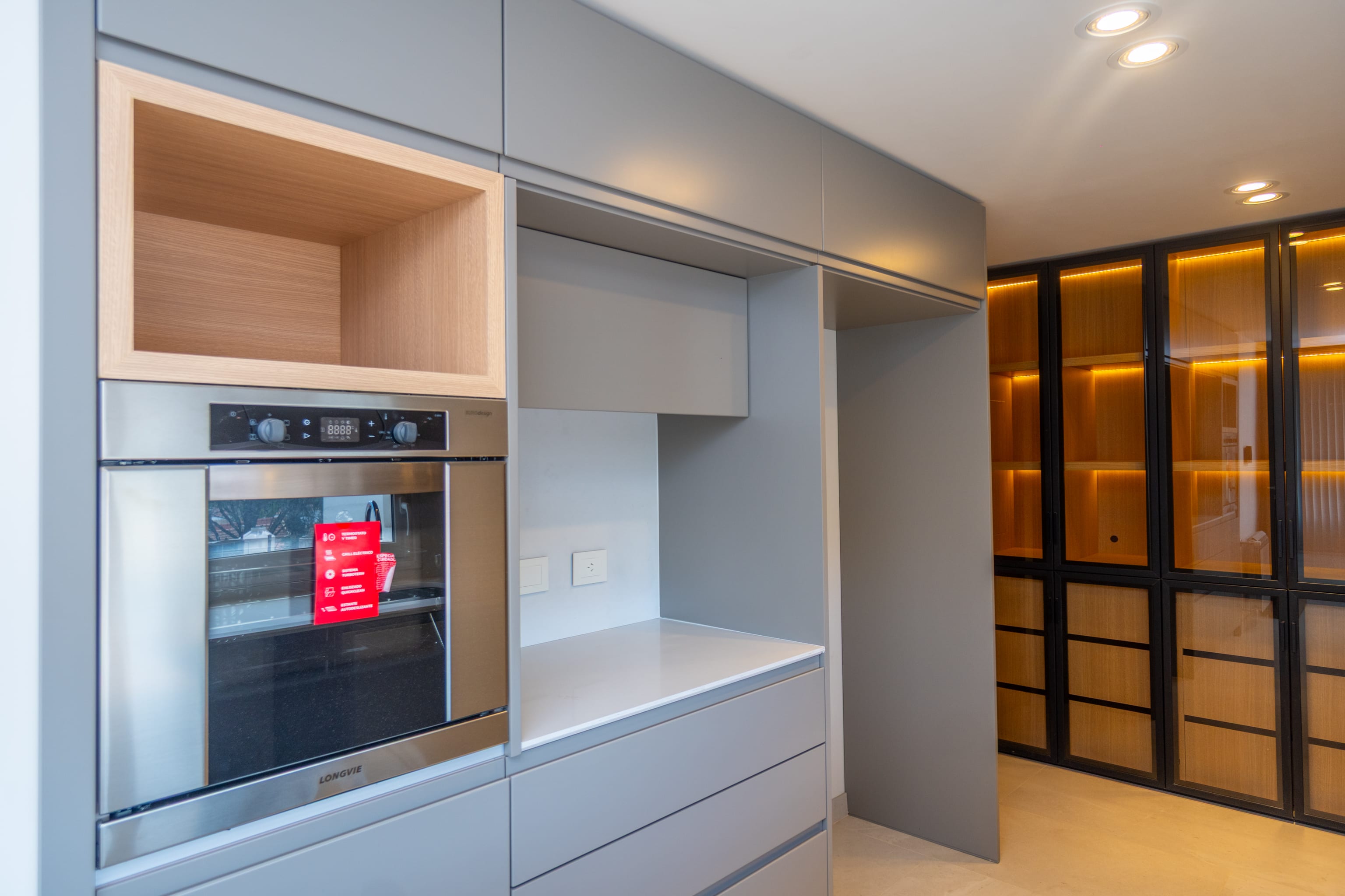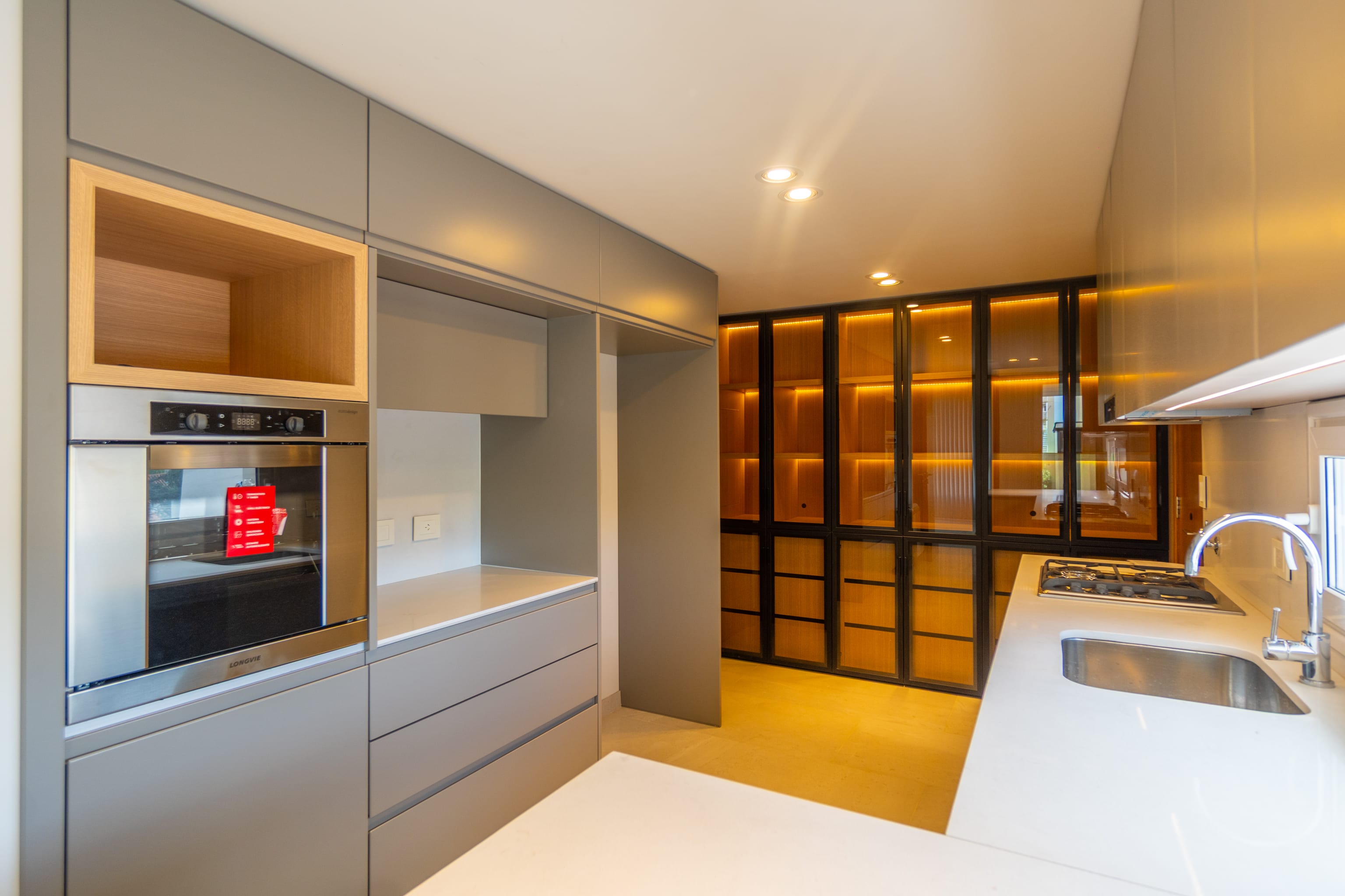 Carpintería a medida de piso a techo con estética moderna y uniforme. Aberturas PVC con DVH garantizando confort térmico y acústico.