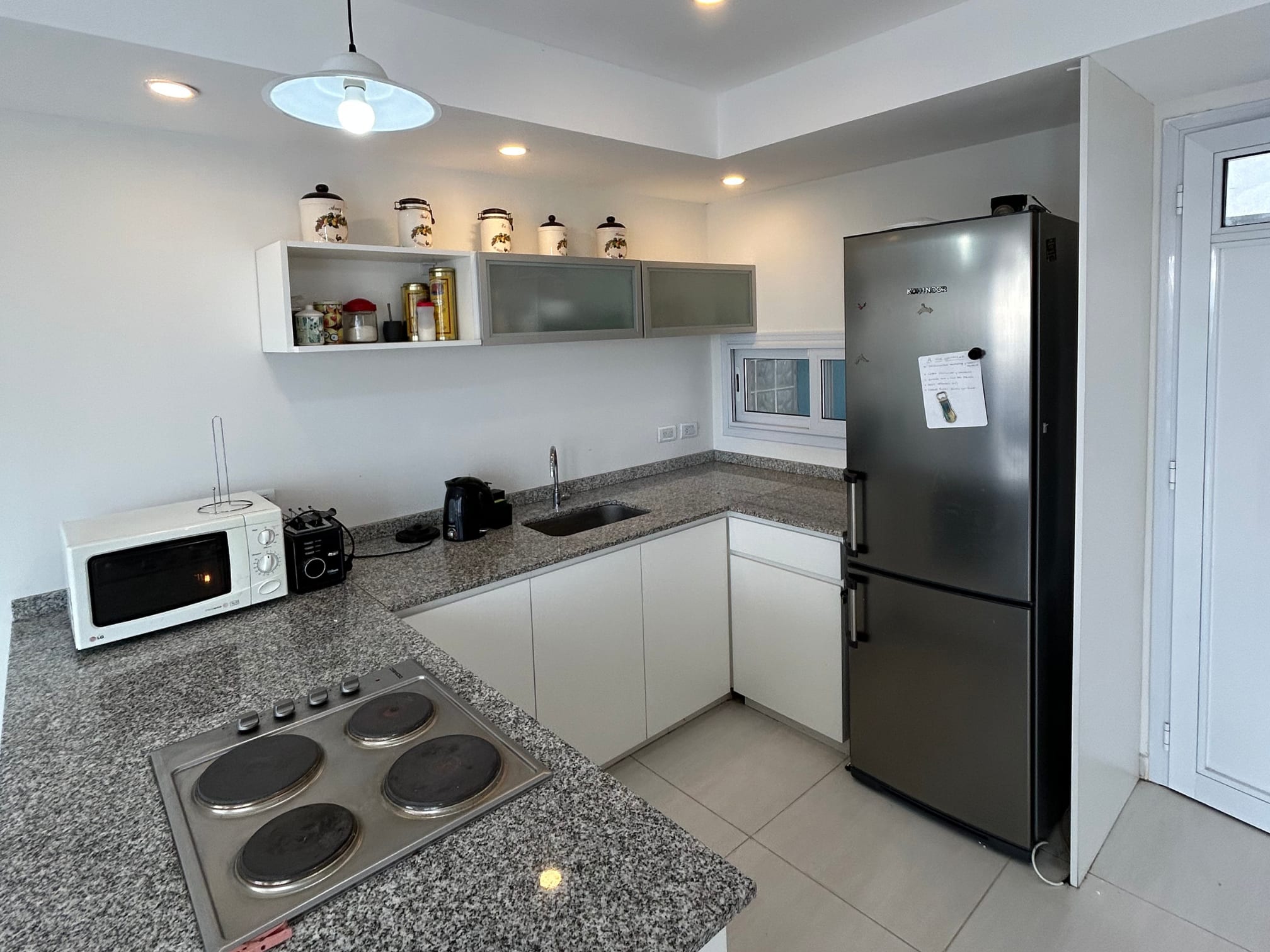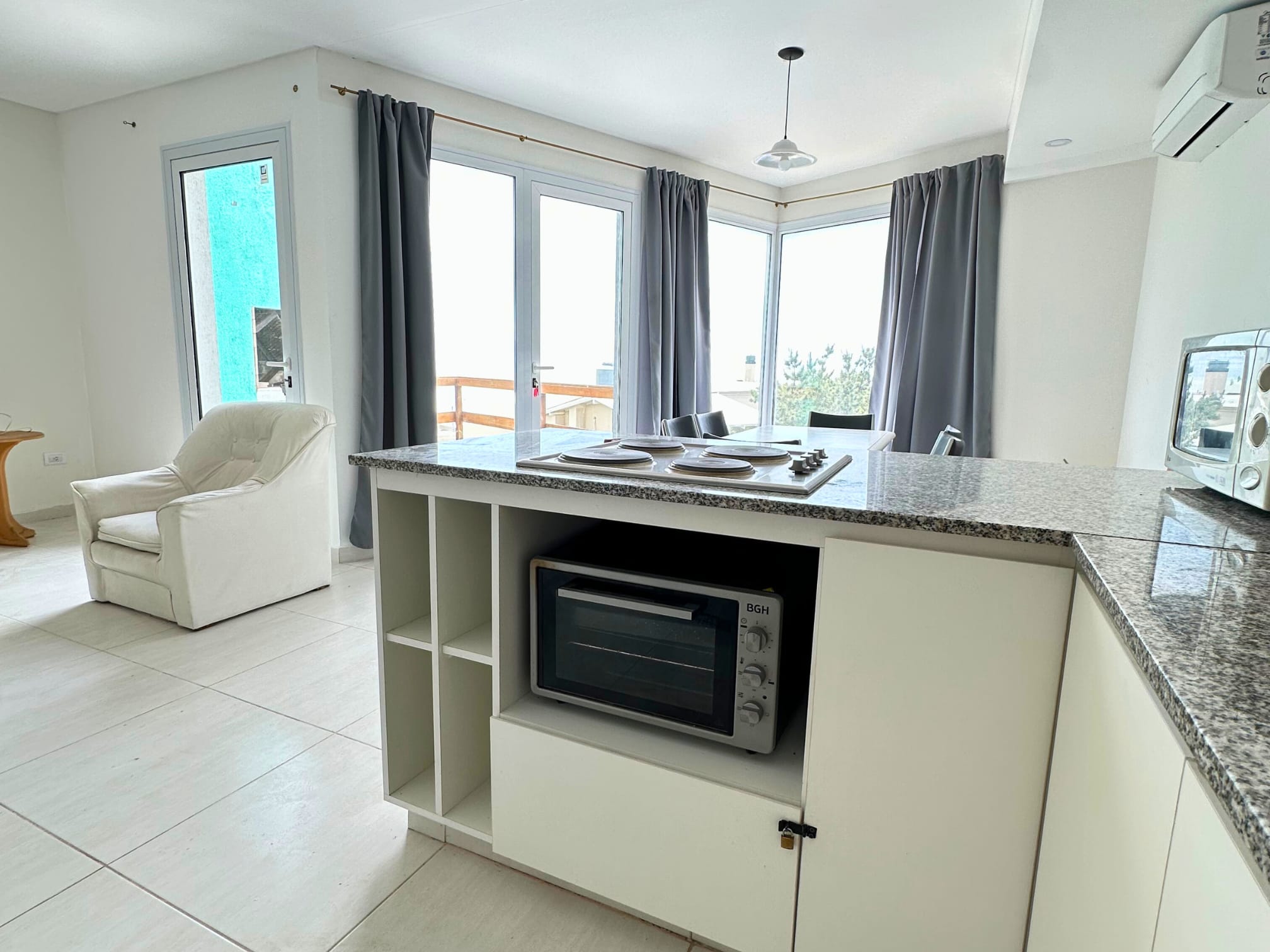 Planta baja: amplio living comedor de concepto abierto integrado con la cocina, balcón con parrilla y agradable vista al mar, y toilette de recepción.