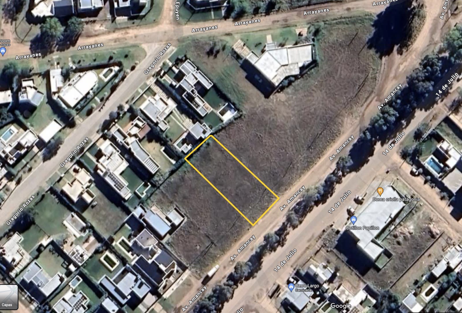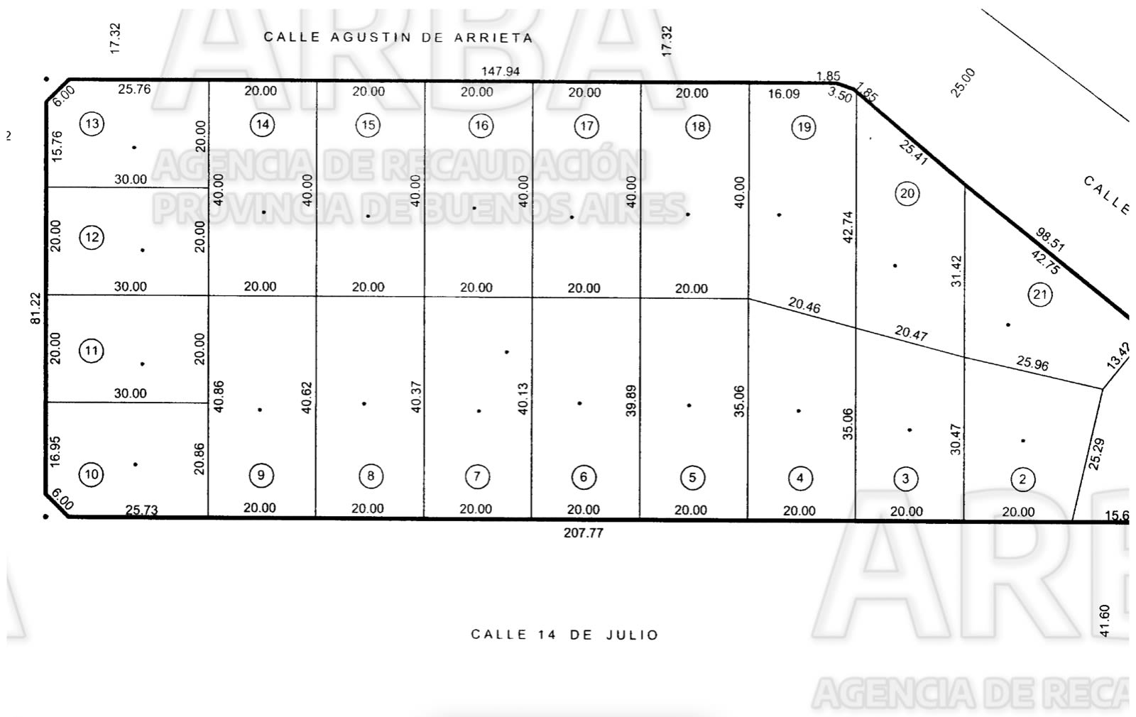 Lote en venta en barrio Patagonia. Frente sobre calle 14 de Julio, entre Luis Agote y Arrayanes. Sup de 795m2. Dimensiones de 20m de frente por 39.89m de fondo.